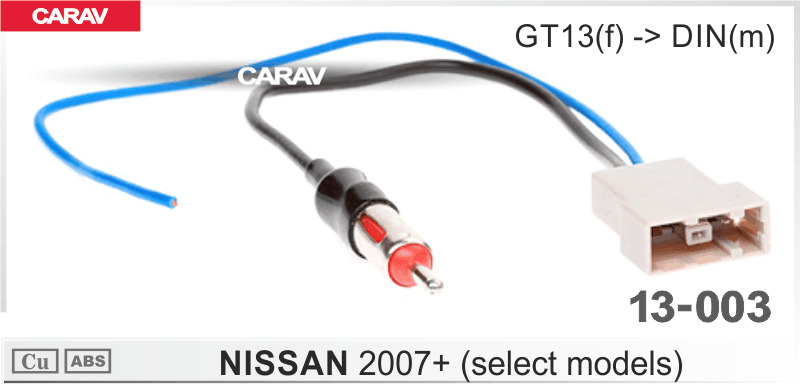 ISO-переходник для а/м NISSAN 2007+ GT13(f) — DIN(m) (антенна) предназначен для подключения штатной радио антенны к стандартному антенному гнезду (ISO) устанавливаемой автомагнитолы после демонтажа штатного головного устройства автомобиля. Подключение Plug & Play.