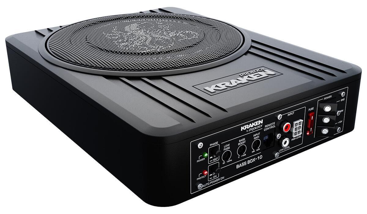 PROLOGY KRAKEN BASS BOX-10 — активный сабвуфер с низкопрофильным компактным корпусом «закрытый ящик» из алюминиевого сплава. Высота корпуса 80 мм и эргономичный дизайн позволяют легко установить сабвуфер в любом месте салона автомобиля. Он идеально подходит для установки под сиденьем. Сабвуфер совместим с любыми автомагнитолами, благодаря возможности подключения двумя способами: с помощью линейных RCA или высокоуровневого входа.