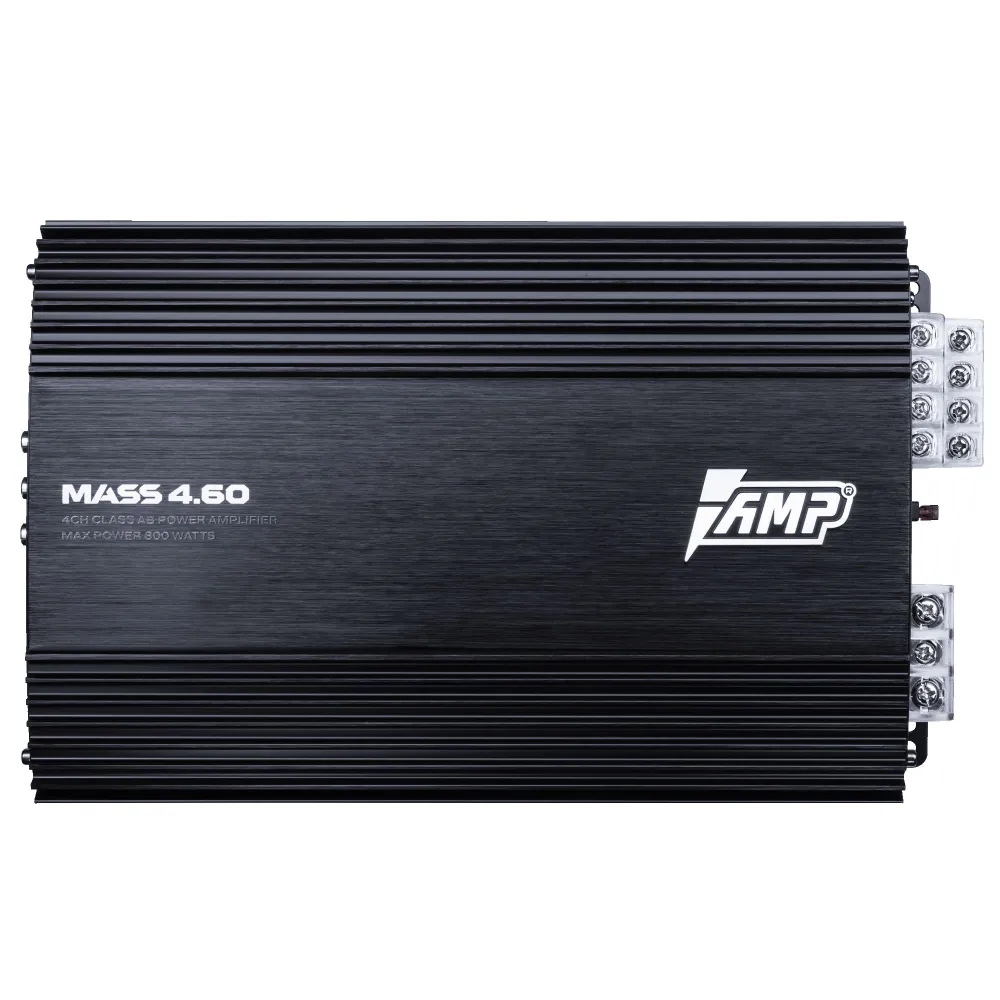 AMP MASS 4.60 пожалуй, самый популярный усилитель из всех представленных новинок. Четыре канала по 60 ватт раскачают любую компонентную акустику начального уровня, а возможность отдать 200 ватт в мостовом режиме позволит подключить к нему простенький сабвуфер. Кроссовер устроен так, чтобы усилитель мог работать с любыми магнитолами и самое главное решать вопросы по канального подключения компонентов.